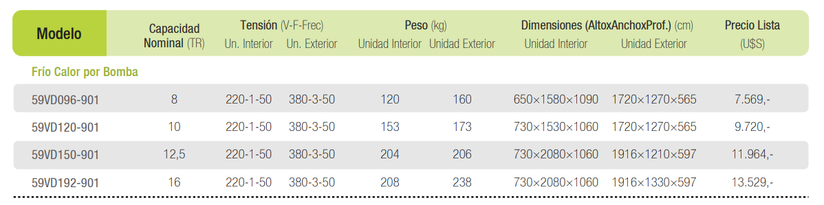 • Bomba de drenaje con capacidad de 1200 mm de columna de agua en las evaporadoras.